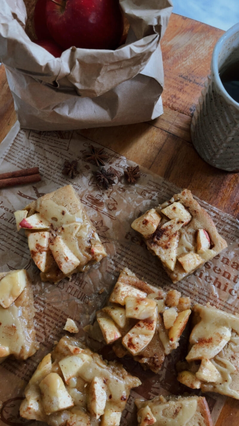 - To make the glaze, add the butter to a small pot. On medium heat, brown the butter. Remove from heat and whisk in the maple syrup, brown sugar, and cinnamon. Drizzle over the apple bars. Let stand for 10 minutes prior to cutting. Serve and enjoy!