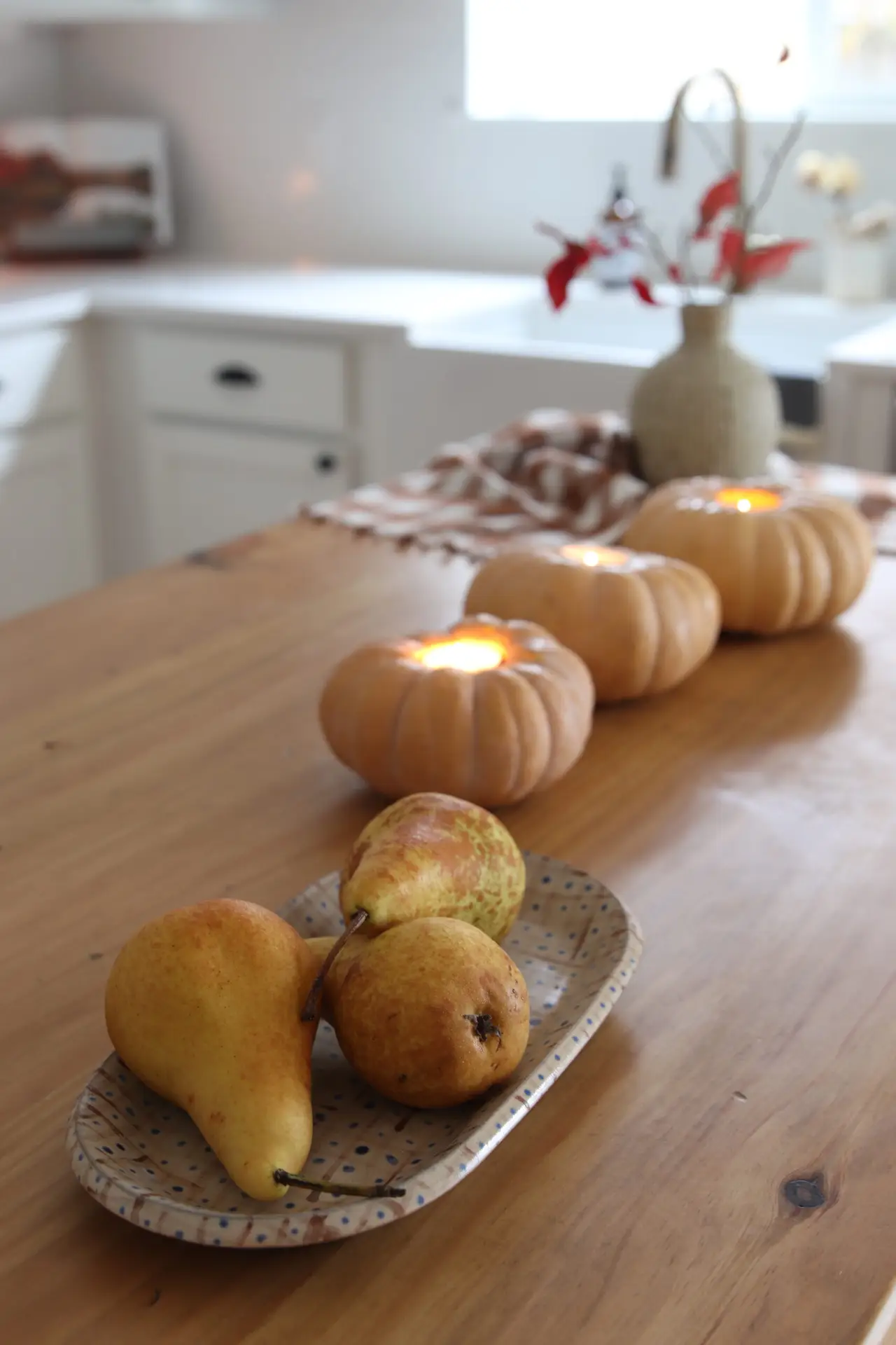 It’s pumpkin carving time! Instead of carving out a large pumpkin to make a Jack o’lantern try this! A trio looks so pretty on the table, island, or vignette and takes less than 20 minutes to make!