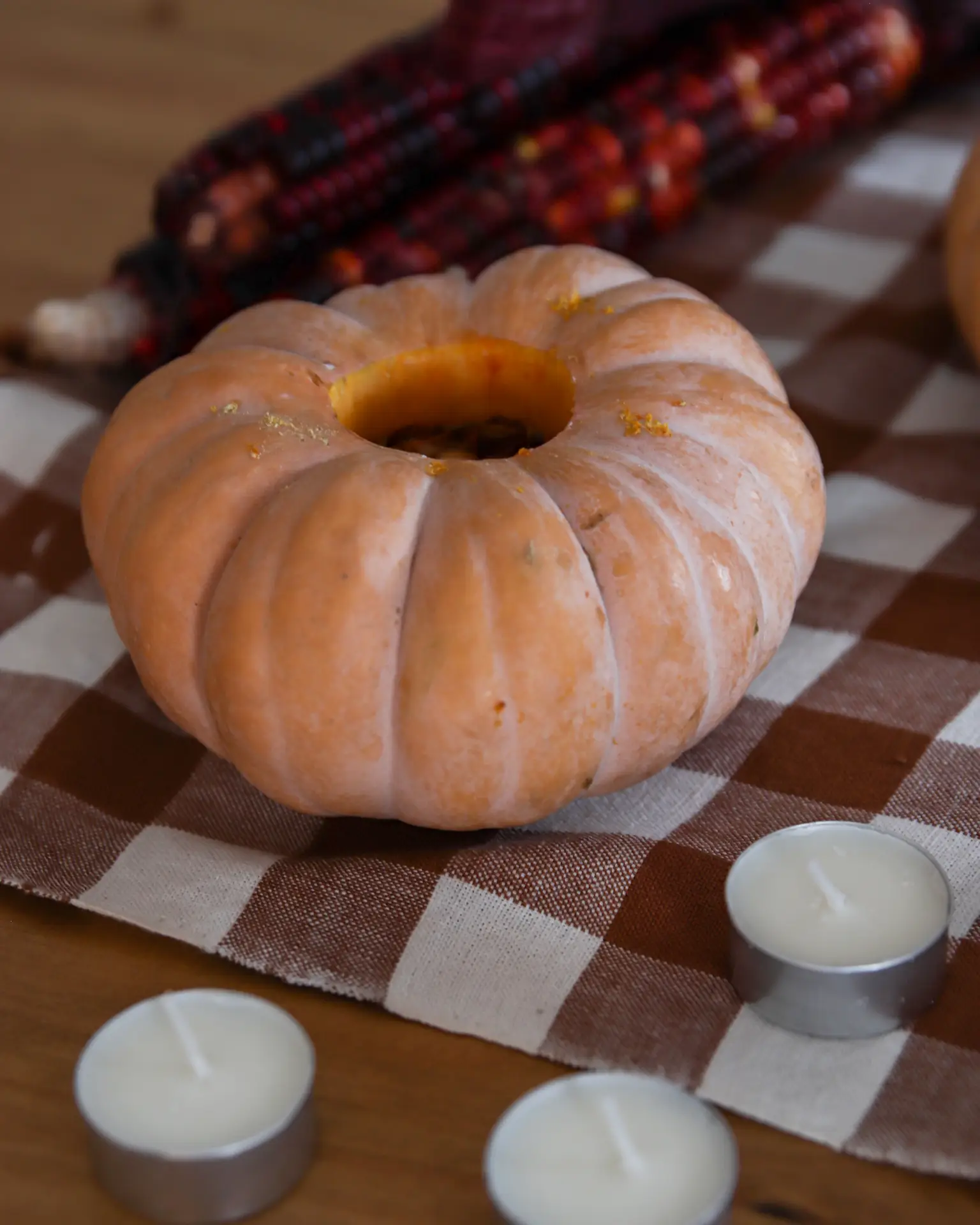 - Next you will need to cut out a spot for your candle. Using a sharp knife, cut along the pencil line and pop off the top and scoop out enough seeds to allow for your tea light to be set inside.