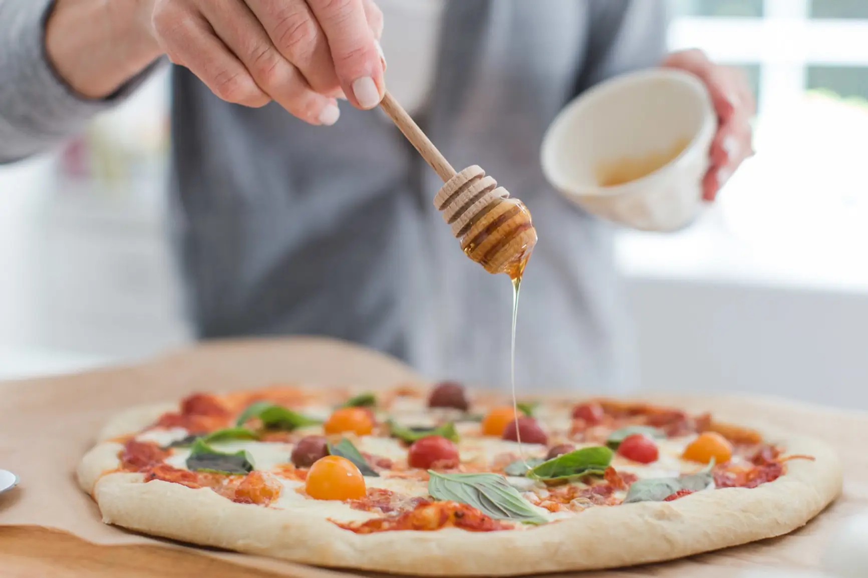 Remove from oven and add basil leaves and a drizzle of honey if you’d like. Allow to cool for a few minutes, slice, and devour!