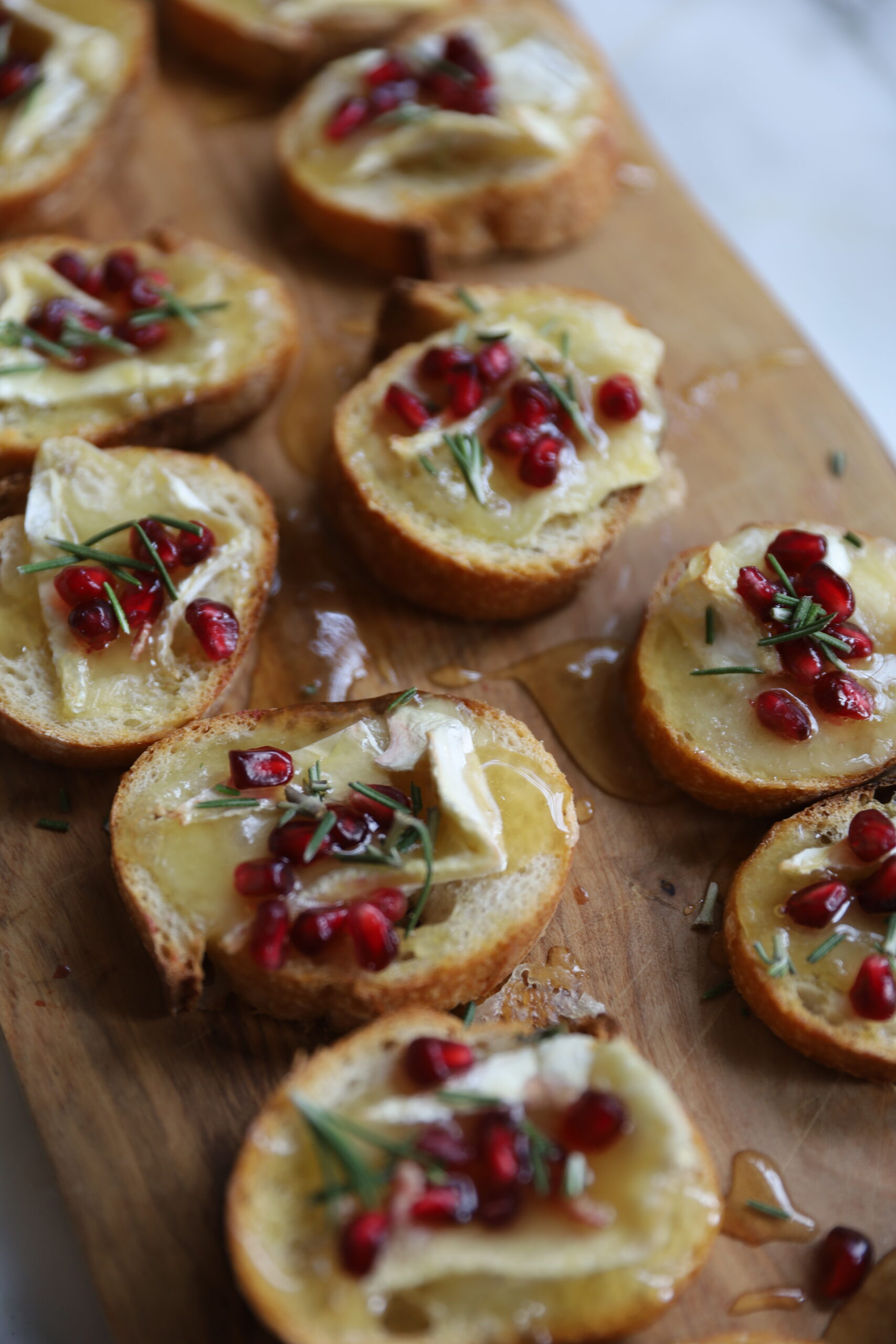 Today I’m sharing my Pomegranate Brie Bites, made with crunchy slices of baguette, melty brie, a drizzle of honey, sparkling pomegranate seeds, and a sprig of rosemary for that fragrant, wintery finish.